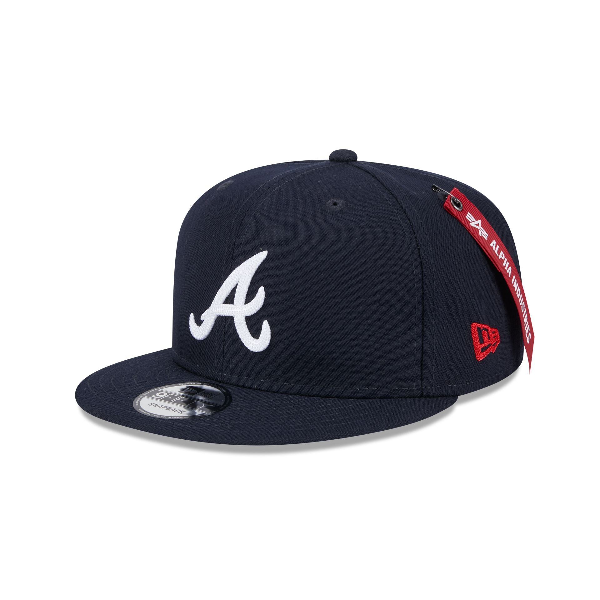 The Alpha Industries x Atlanta Braves Navy 9FIFTY Snapback features a chainstitch embroidered Braves logo at the front panels with an alternate team logo at the right-wear side, a signature Alpha Industries red ribbon at the left-wear side, and a snapback closure at the rear.