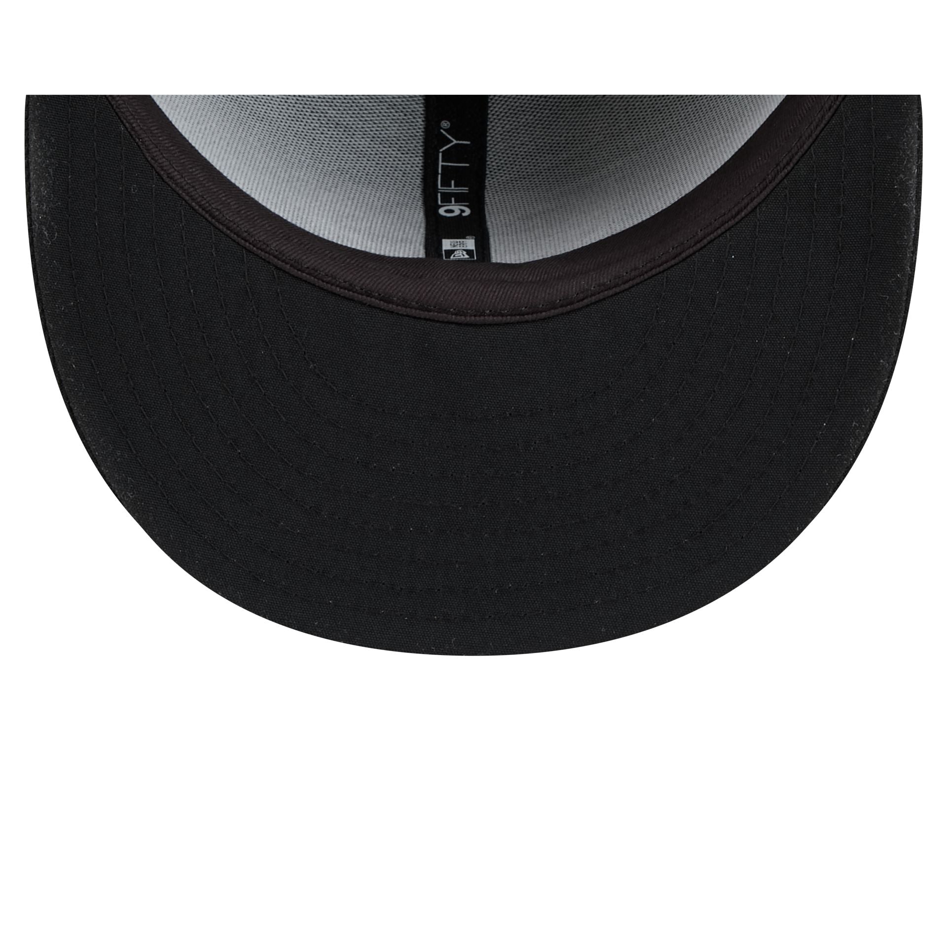 The Alpha Industries x Brooklyn Nets Black 9FIFTY Snapback features a chainstitch embroidered Nets logo at the front panels with a matching NBA Logoman at the right-wear side, a signature Alpha Industries red ribbon at the left-wear side, and a snapback closure at the rear.