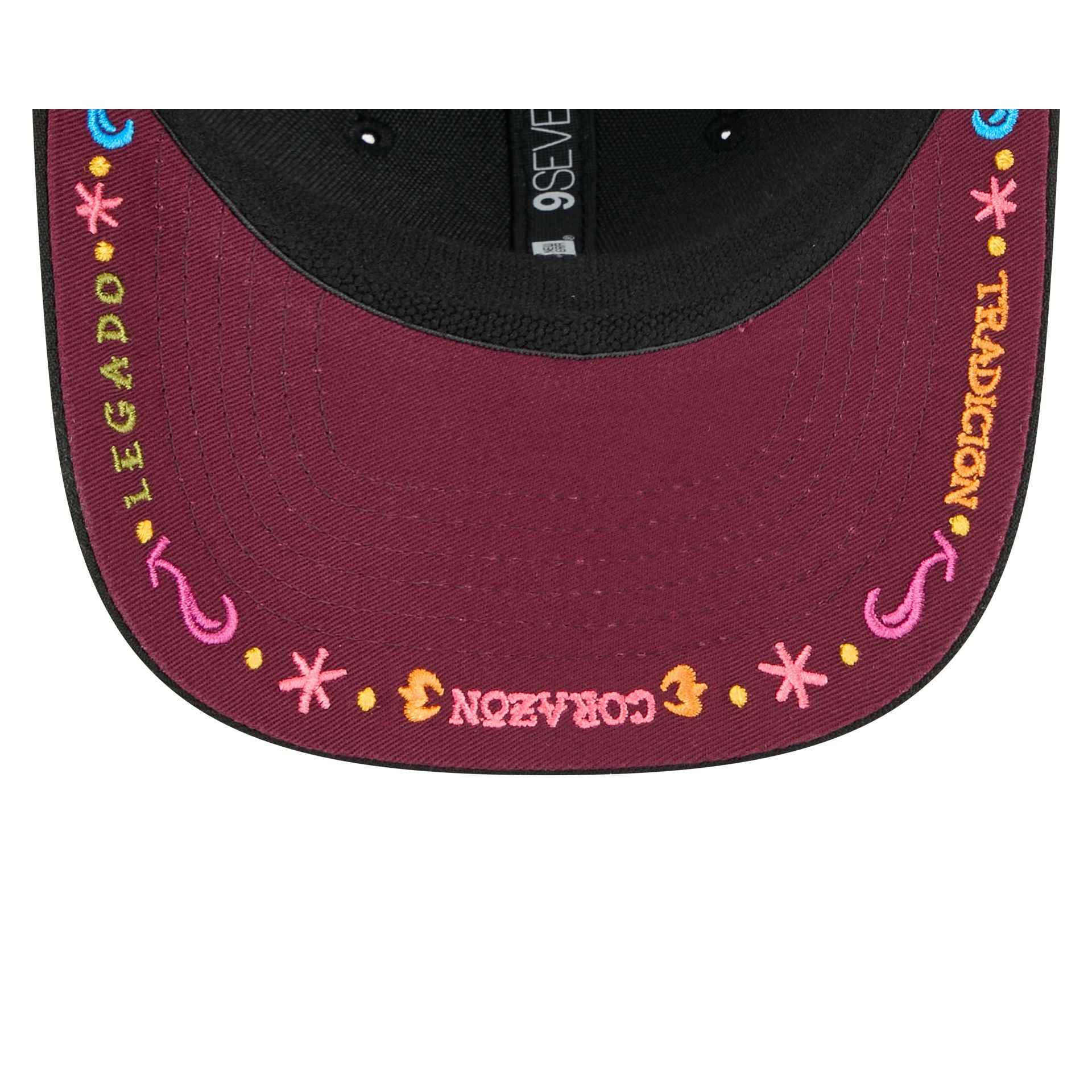 The Las Vegas Raiders Black Color Pop 9SEVENTY Stretch-Snap features an embroidered Raiders logo and Black Color Pop design at the front panels. Additional details include design at the visor, and an undervisor that reads: Tradición, Corazón y Legado, meaning Tradition, Heart and Legacy. A matching NFL Shield is shown at the rear with an adjustable snapback closure.