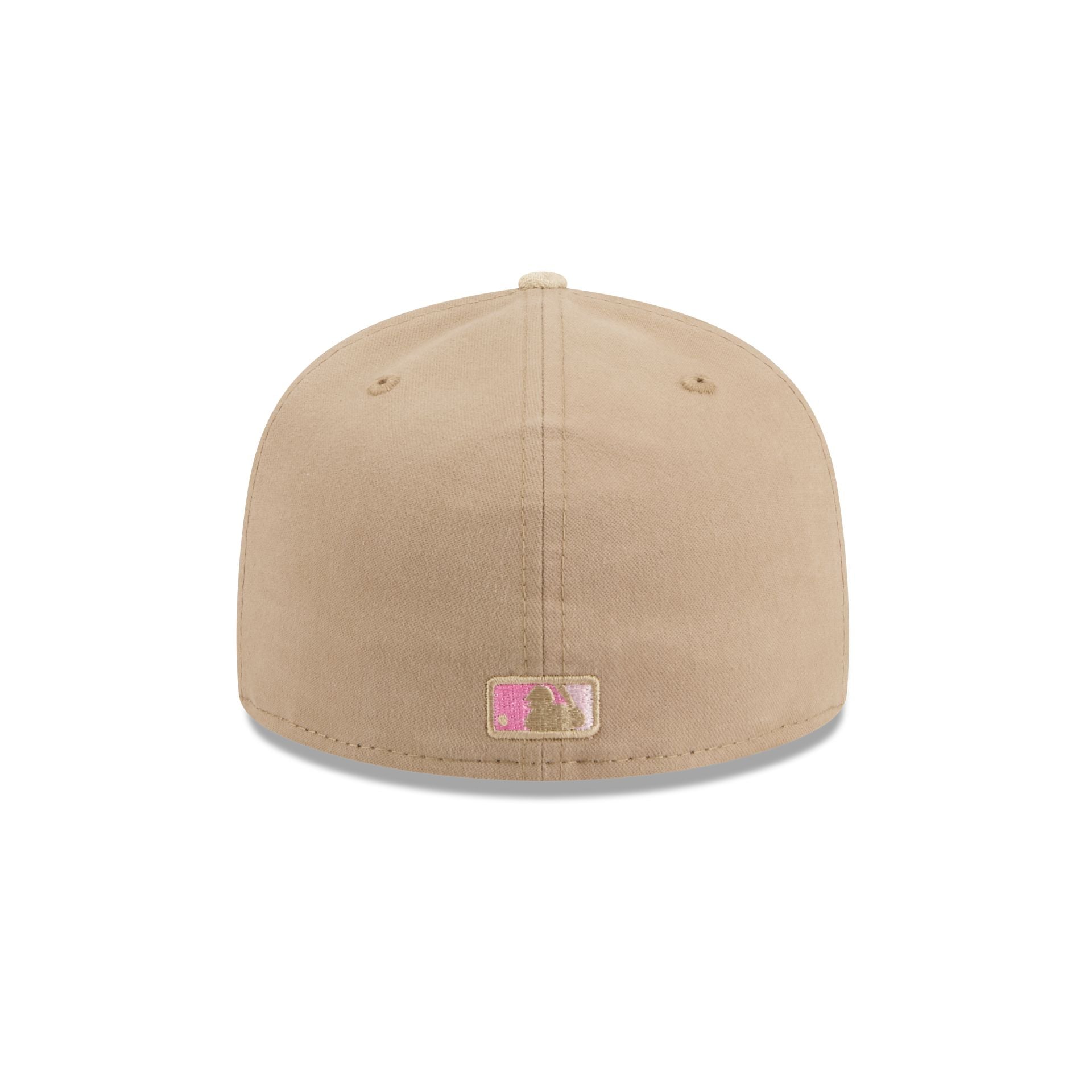The New York Yankees Hand Stitched Floral 59FIFTY Fitted Cap features an embroidered Yankees pink logo at the front panels with a matching MLB Batterman logo at the rear. Additional details include a flower embroidery at the visor and a gray undervisor.