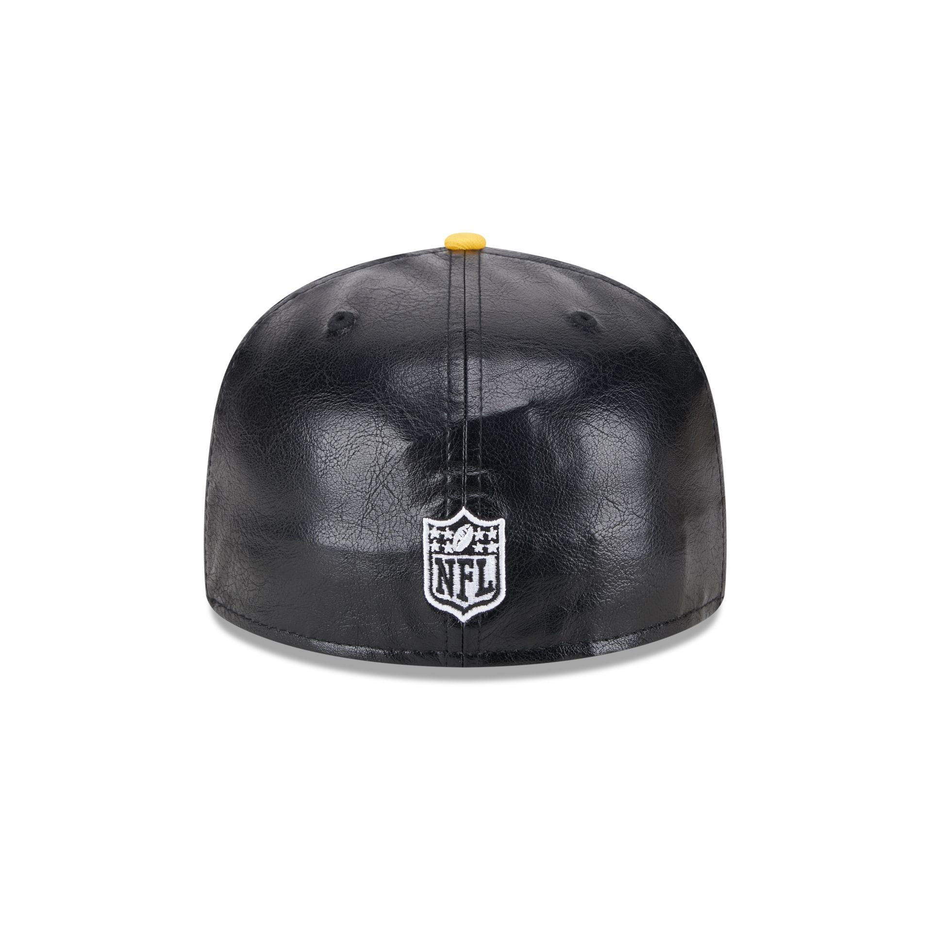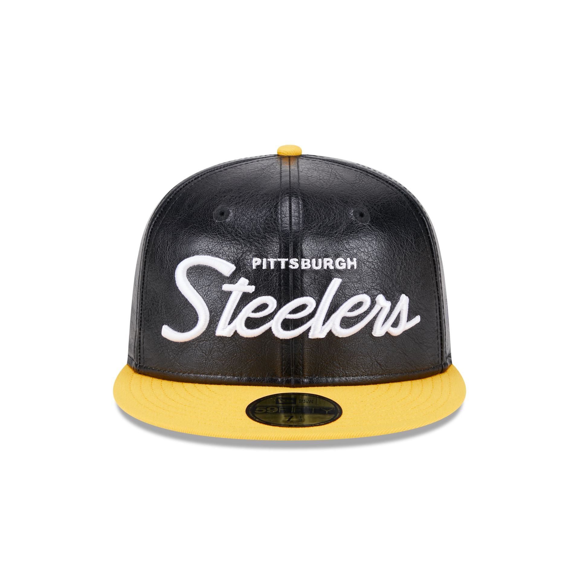 The Pittsburgh Steelers Faux Leather Crown 59FIFTY Fitted Cap features an embroidered Steelers wordmark at the front panels with a matching NFL Shield at the rear, a yellow visor, and green undervisor.